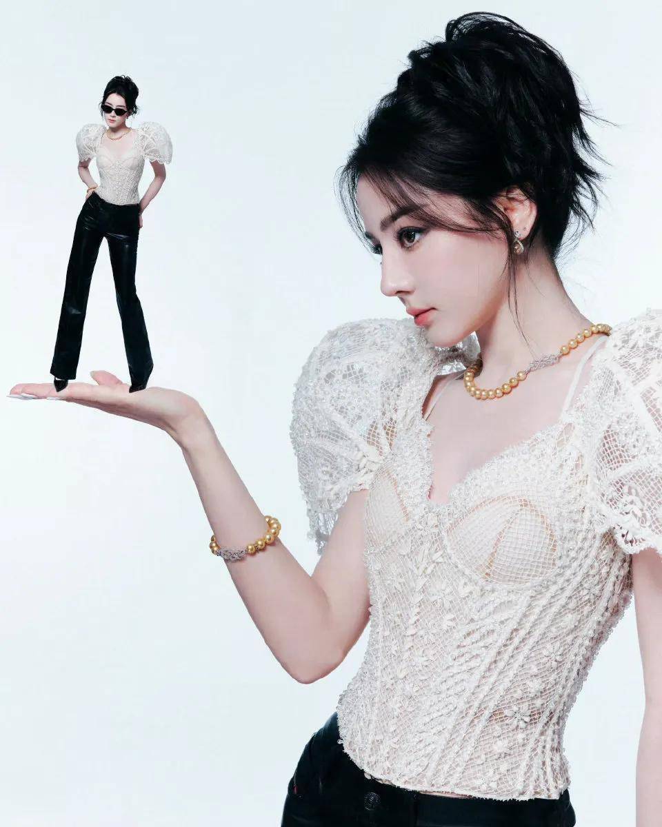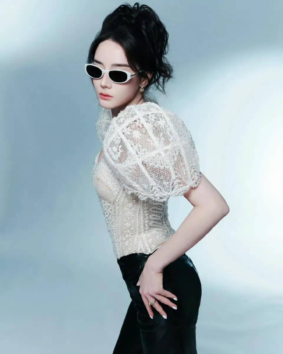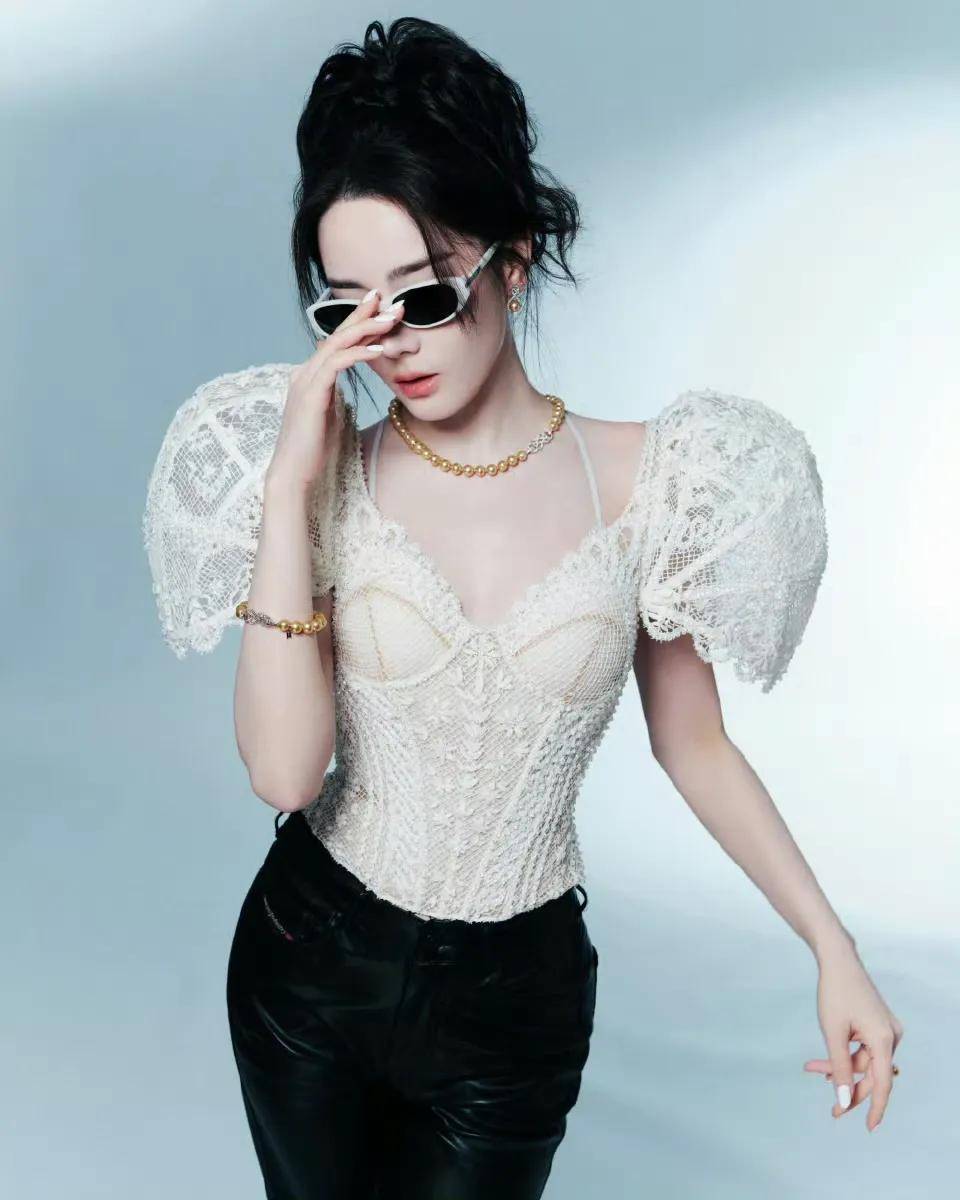 不得不说这个蕾丝廓形上衣很独特了!像两个小翅膀一样插在肩膀上!而领口和衣服本身则更像紧身胸衣,展现出迪丽热巴迷人身材!