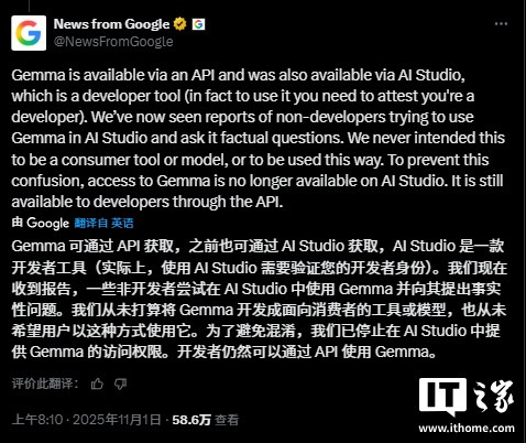 IT之家注意到,谷歌官方新闻账号在X平台的一则帖文中表示,公司“注意到有报道称非开发者用户试图在AIStudio中使用Gemma模型,并向其提出事实性问题。”AIStudio是一个专为开发者设计的平台,并非普通消费者访问谷歌AI模型的常规渠道。Gemma系列模型明确针对开发者推出,包含适用于医疗、编程以及文本与图像内容评估等多个用途的变体。