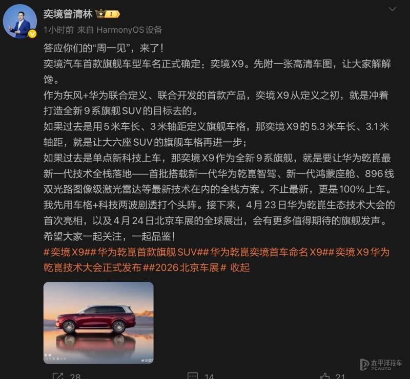 【太平洋汽车 新车频道】近日奕境汽车品牌总经理曾清林在社交软件发文称,旗下大六座旗舰SUV正式命名为奕境X9。新车拥有5.3米车长和3.1米轴距,同时搭载新一代华为乾崑智驾、新一代鸿蒙座舱、896线双光路图像级激光雷达等最新技术在内的全栈方案。
