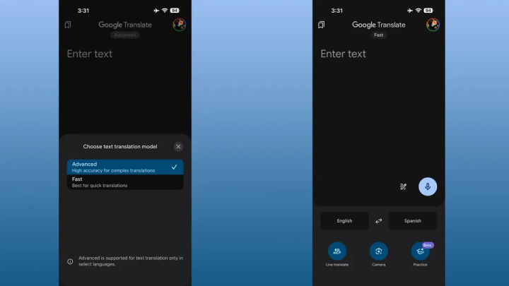 IT之家在此援引AndroidCentral报道,谷歌将这些新增内容称为“文本翻译模型”,用户可在App顶部Logo的下方切换模型,进阶模式可提高复杂文本的翻译准确度,而快速回应模式则适用于日常交流等场合,在最快时间给出翻译结果。